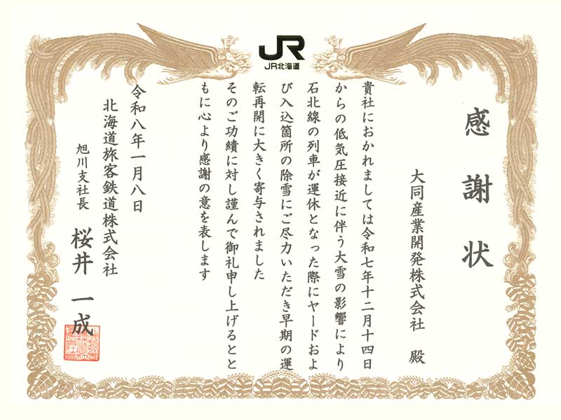 令和7年12月14日の低気圧接近に伴う大雪により、JR石北線の運行に大きな影響が生じました。こうした状況下での当社の対応が早期の運転再開に寄与したとして、北海道旅客鉄道株式会社(JR北海道)様より感謝状を賜りました。