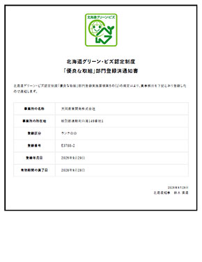 当社は北海道グリーン・ビズ認定制度における「優良な取組」部門(環境に配慮した一定の取組を実施している事業所を登録する部門)に登録、環境に配慮した自主的な取組を実施・促進することにより、地域の環境の保全及び創造に貢献し、環境と経済が調和する持続可能な地域の創造に寄与いたします。